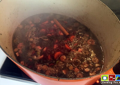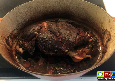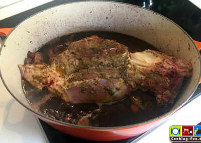 Wenn der Wein auf die Hälfte reduziert ist, wird die Keule auf dem Gemüse gebettet und der Fond (bzw. das Wasser) angegossen. Noch einmal aufkochen und ohne Deckel in den vorgeheizten Ofen.