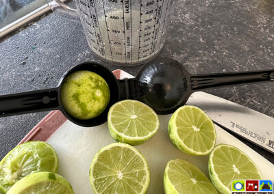 Die Limetten heiß waschen und die Schale fein abreiben (nur die grüne Schicht), den Saft auspressen und etwa 150ml abmessen. Die Maisstärke in einem Schuss kaltem Wasser anrühren