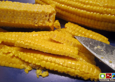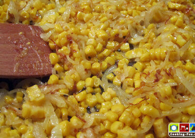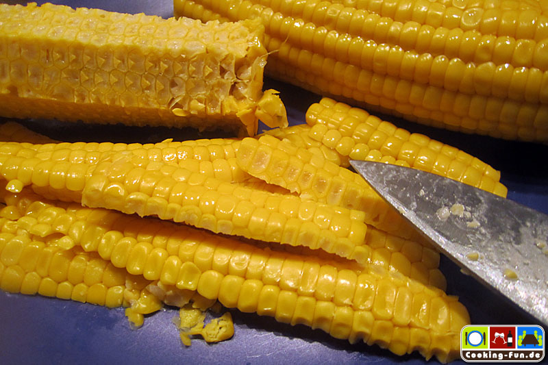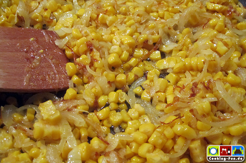 Nebenbei die Maiskörner von den Kolben schneiden. (Die schmecken besser als Dosenmais, der geht aber auch. Einfach eine kleine Dose nehmen, Mais abspülen und abtropfen lassen). Wenn die Zwiebeln goldbraun sind, den Mais zugeben und mit braten. Dabei die Körner etwas vereinzeln, das geht leichter, wenn sie schon etwas Wärme genommen haben.