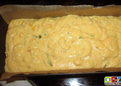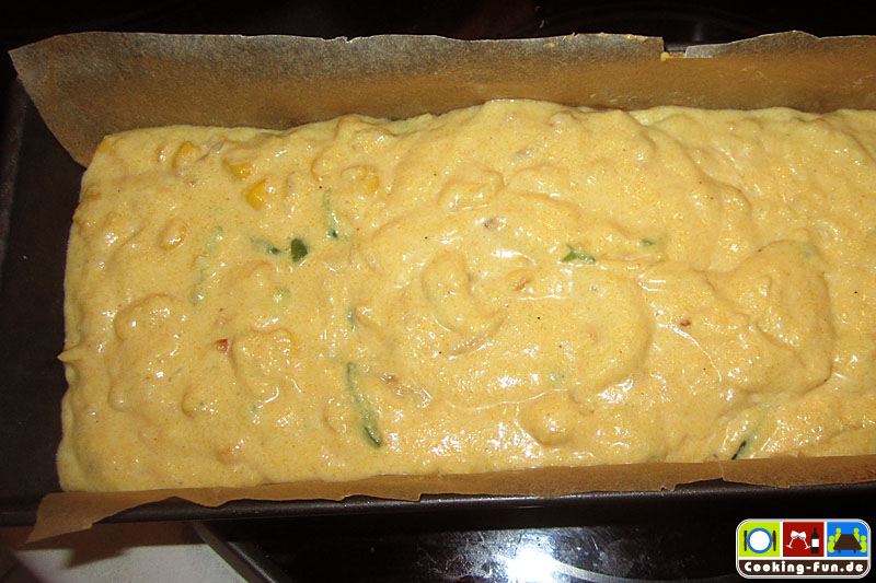 Eier verquirlen, mit Milch und Buttermilch vermischen und in eine Rührschüssel geben, in der Polenta, Mehl und Backpulver bereits warten. Alles ordentlich verrühren.