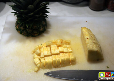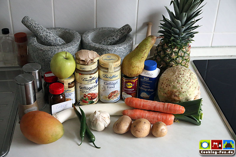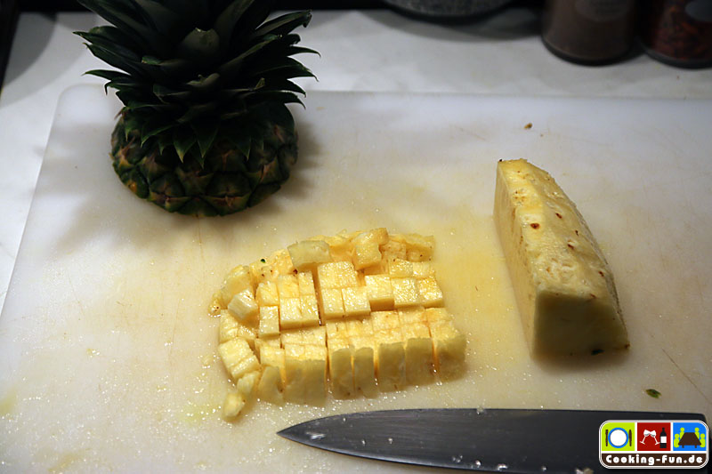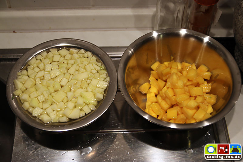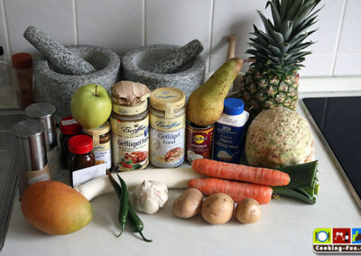 Bei der Einlage schließe ich mich den Rezepten mit Fruchteinlage an, denn einerseits gibt es später eine gute Portion Huhn und andererseits können eben die Früchte angeschnitten werden, die dann im Nachtisch (Fruits) aufgebraucht werden.
