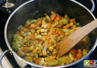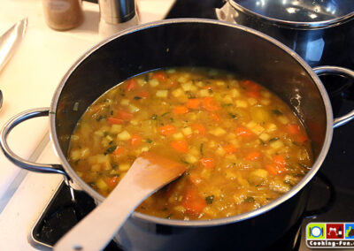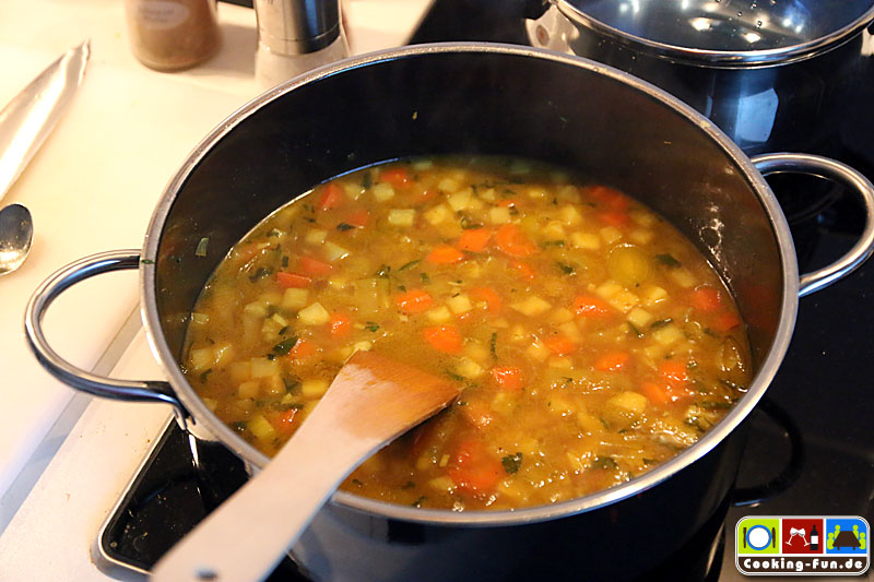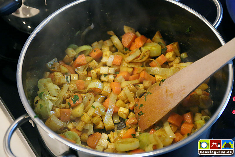 Das Gemüse im schweren Topf bei mittlerer Hitze in etwas Öl farblos anschwitzen, Curry und Kurkuma kurz zugeben (die sollen ihre Farbe etwas ändern und mehr Aroma entwickeln), dann mit der Hühnerbrühe ablöschen, Ingwer, Knoblauch und Chili beigeben und für ca. 20 Minuten köcheln lassen. Das Gemüse soll weich werden.