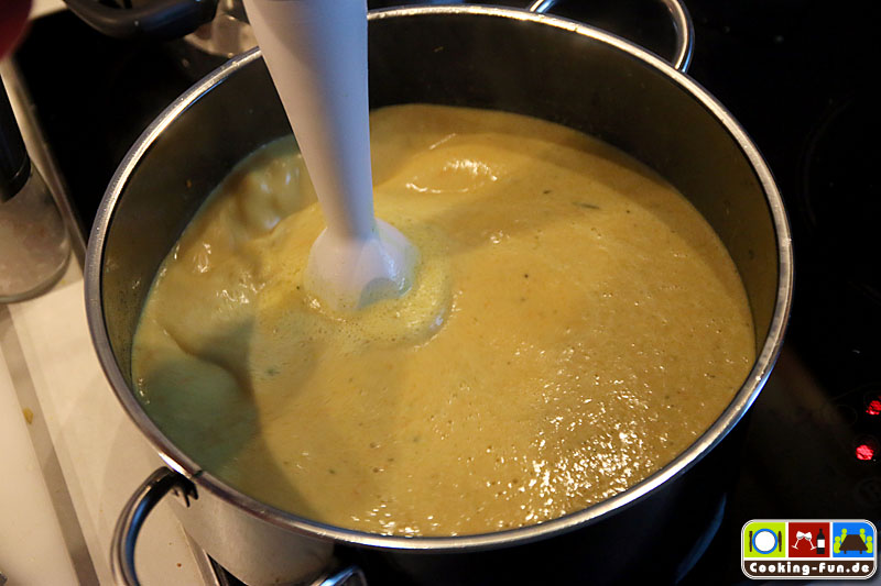 Nun kommen Sahne und Kokosmilch dazu und mit dem Pürierstab alles fein pürieren. Bei milder Hitze noch ein paar Minuten ziehen lassen, dabei mit Sherry, Zitronensaft, Salz, Pfeffer abschmecken.