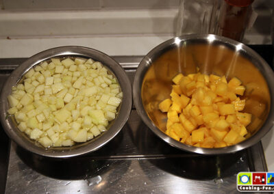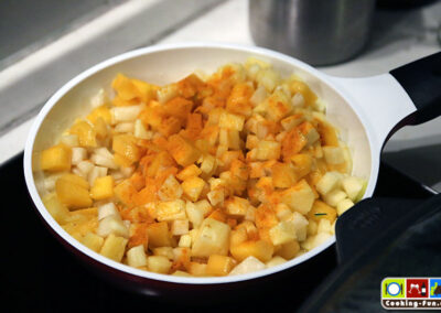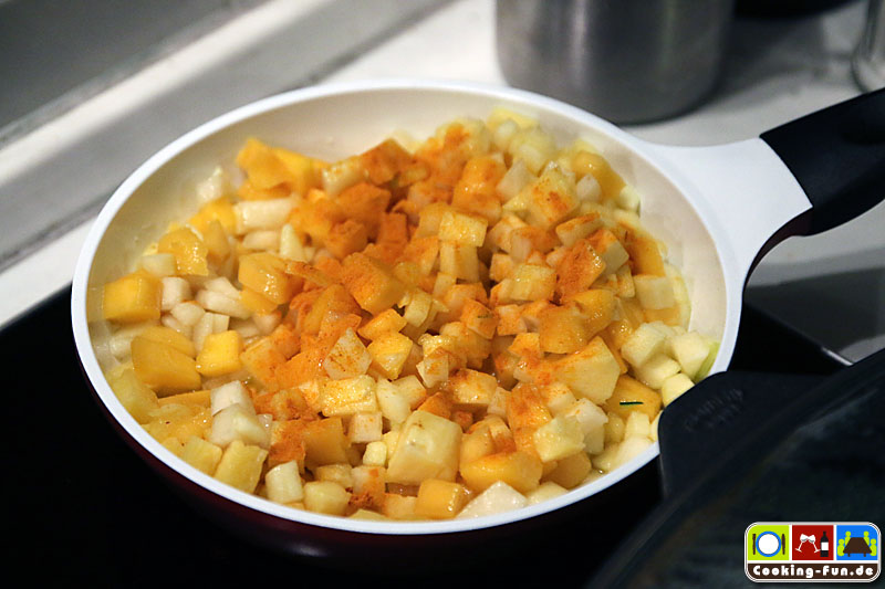 Schnell noch in einer Pfanne die Obstwürfel in Olivenöl und mittlerer Hitze für ca. zwei Minuten dünsten, dabei mit einem TL Kurkuma abschmecken.