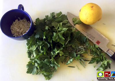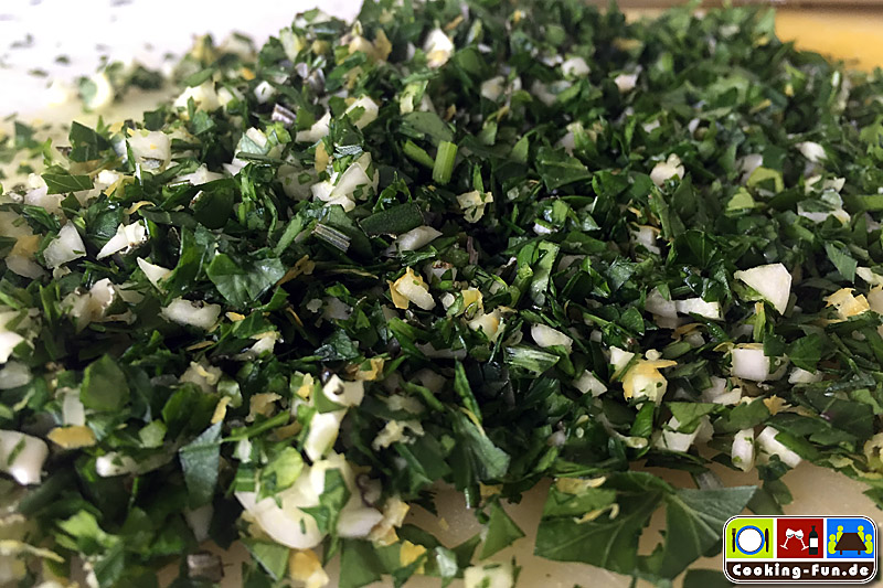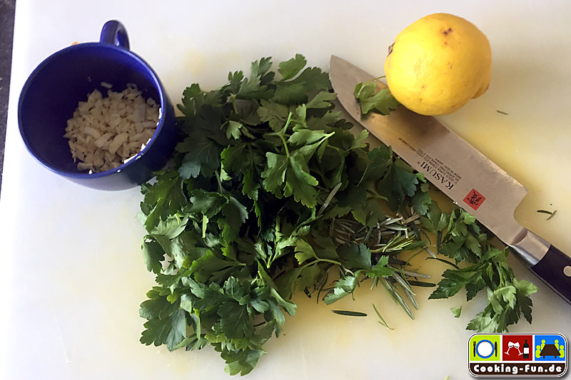 Diese Kräutergarnitur kann man nebenher fertigstellen. Von der gewaschenen (Bio-) Zitrone die gelbe Schicht der Schale abreiben, Kräuter und Knoblauch hacken und alles miteinander vermengen. Die Gremolata über die Beinscheiben streuseln.