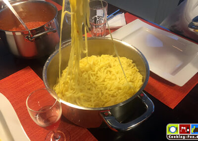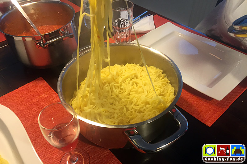 Kurz bevor das Fleisch fertig ist, muss die Tomatensoße erwärmt und die Nudeln gekocht werden.