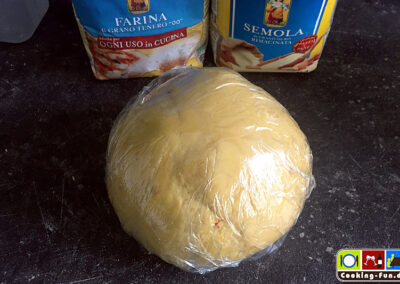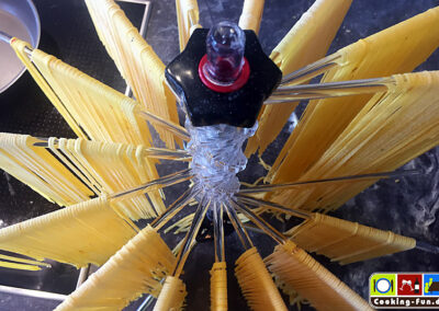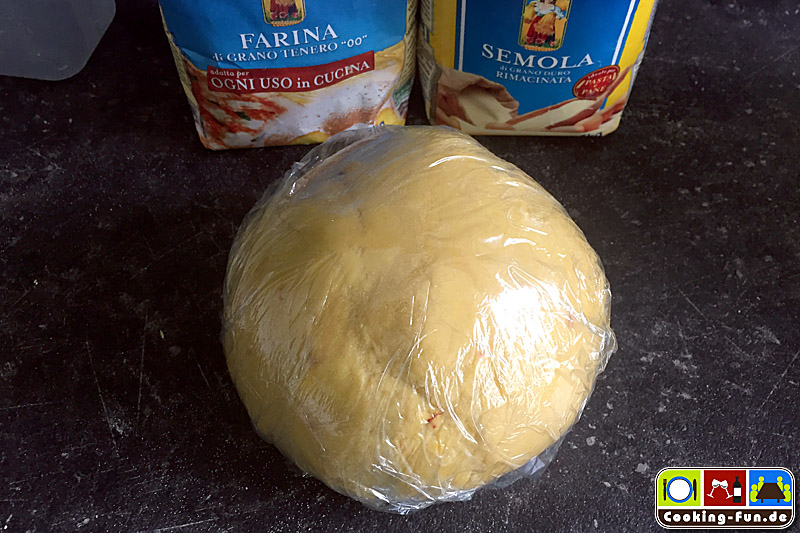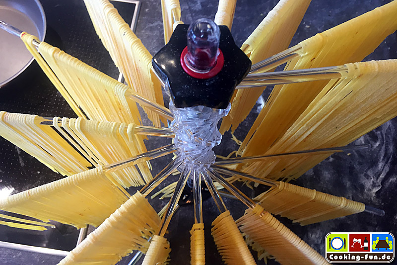 Die Nudeln machen wir nach meinem Basis-Nudelteig selbst und fügen dem Teig eine gute Priese Safran (in 3EL heißem Wasser kurz eingelegt und etwas angemörsert) für Geschmack und Farbe zu. Muss aber auch nicht zwingend sein. Sie können jederzeit vorbereitet werden und auf dem Trockenständer oder zu Nestern gerollt auf Ihren Einsatz warten. Im kochenden Salz-Wasser sind sie dann bei Bedarf nach 2-3 Minuten verzehrfertig.