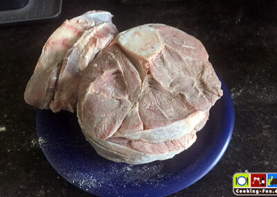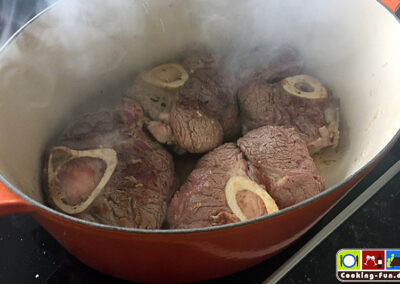 Für das Ossobuco verwenden wir Beinscheiben vom Kalb (Idealfall. Alternativ kann man auch Rinderbeinscheiben verwenden). Vorbereitend werden sie von größeren Fettbereichen und Sehnen befreit (sollen aber noch zusammenhalten) und leicht mehliert (in Mehl wenden, überschüssiges Mehl z.B. über der Spüle vorsichtig abklopfen). Butter oder Olivenöl (nach Gusto) in einem großen Bräter schmelzen und darin die Beinscheiben anbraten. Sie sollen zwar etwas Farbe bekommen, das verwendete Fett darf aber nicht verbrennen und bitter werden.