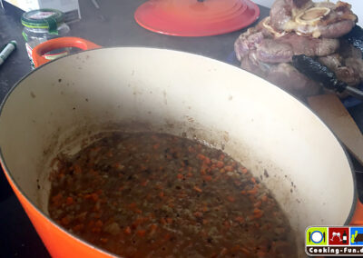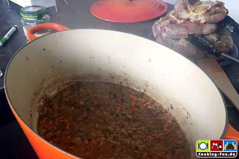 Wenn die Beinscheiben dann etwas angebräunt sind, werden sie aus dem Bräter gehoben und die Hälfte des Soffritto kommt hinein.
