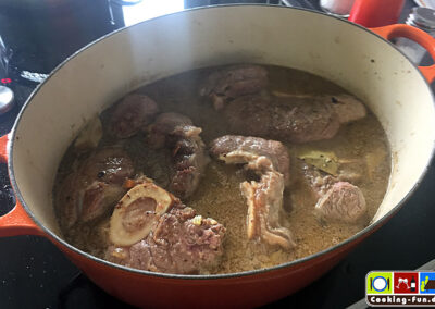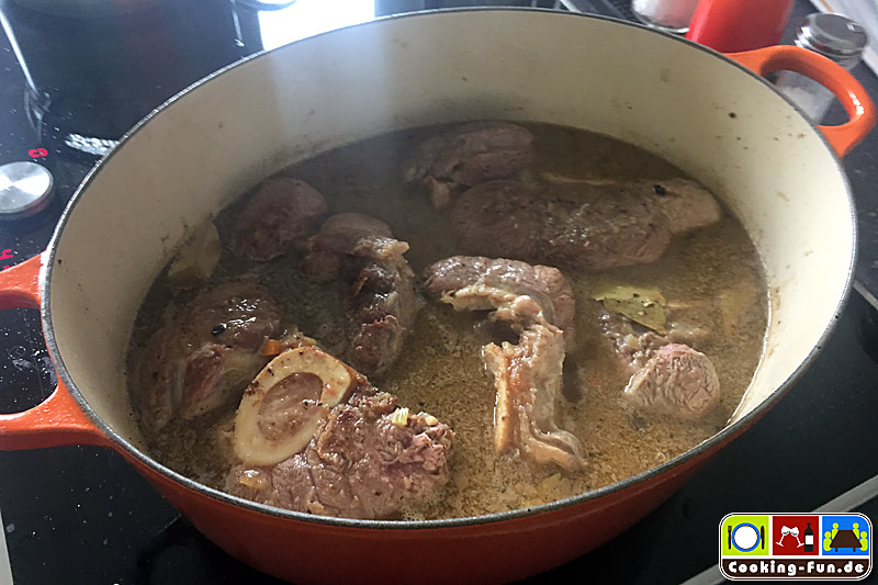 Im nächsten Schritt den Fond bzw. die Rinderbrühe angießen (Die Flüssigkeitsmenge hängt von der Fleischmenge, Brätergröße etc. ab). Tut Euch selbst einen Gefallen und verwendet jetzt kein Instantpulver mit Geschmacksverstärkern, nachdem durch das Soffritto so schöne, natürliche Aromen entstanden sind. Dann lieber nur Wasser (etwas weniger) verwenden. Lorbeerblätter zugeben, mit Salz und Pfeffer leicht würzen und die Beinscheiben wieder hineinlegen.
