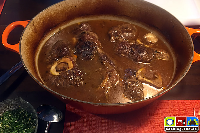 Die Soße vorm Servieren noch etwas entfetten (abschöpfen). Die Beinscheiben vorsichtig aus dem Sud heben, damit das Knochenmark in den Knochen bleibt. Das ist ja überhaupt das Allerleckerste.