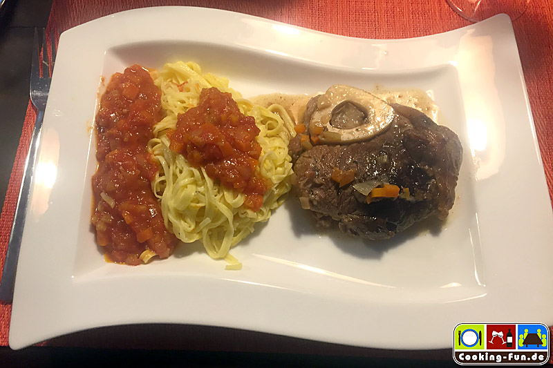 Ich liebe die italienischen Namen von Speisen. Es klingt gleich nach Sterneküche. Dabei gibt es hier ein Bauerngericht: Kalbshaxe mit Nudeln und Tomatensoße.