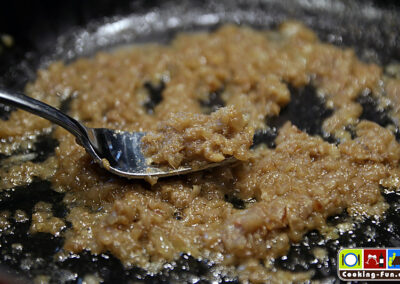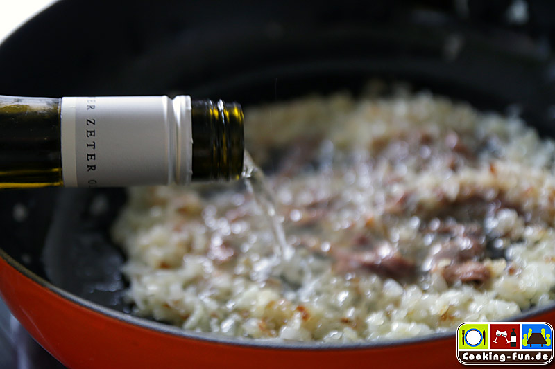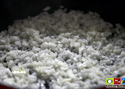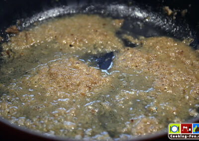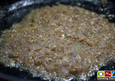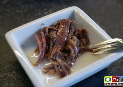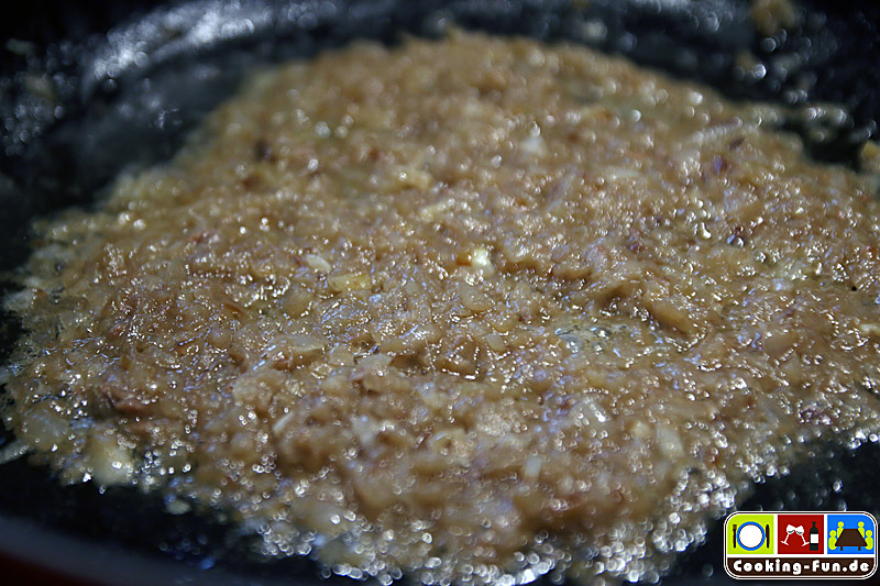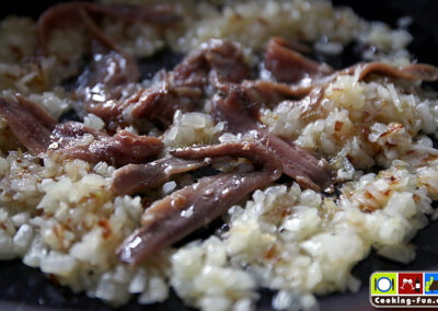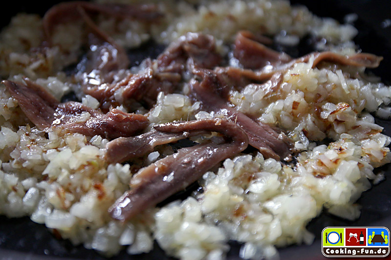 Die weißen Zwiebeln fein würfeln und in einer schweren Pfanne im Olivenöl bei kleiner bis mittlerer Temperatur schmoren. Ganz langsam, die Zwiebelwürfel sollen keine Farbe nehmen sondern langsam „schmelzen“. Wenn sie – so nach etwa 25-30 Minuten – fast zerfallen, kommen die Sardellenfilets hinzu. Eine Minute später dann noch den Weißwein angießen. Alles zusammen weiterköcheln lassen (nochmals etwa 15-20 Minuten), bis die Sardellen ebenfalls zerfallen sind und die Flüssigkeit verkocht ist. Mit einer Gabel nun alles zu einer cremig-dicken Paste manschen (da ist nicht mehr viel zu tun, wenn alles richtig eingekocht ist).