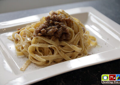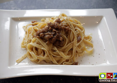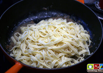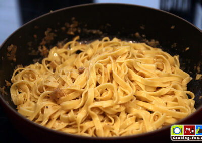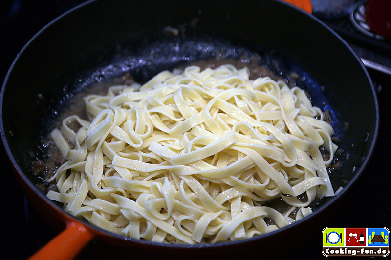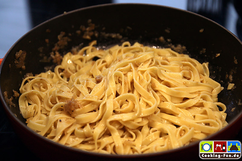 Wenn die Zwiebeln glasig werden, kann schon mal das Wasser aufgesetzt werden. Wasser leicht salzen, aber Achtung, die Sauce ist salzig im Aroma, also nicht übertreiben. Berücksichtigt die Garzeit Eurer Nudeln. Sie sollten mit der Sauce fertig werden. Die Nudeln abgießen und vom Kochwasser etwas auffangen.