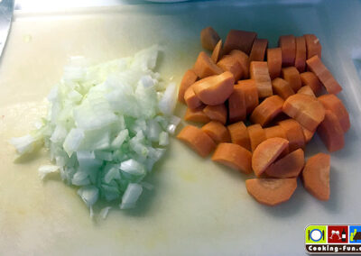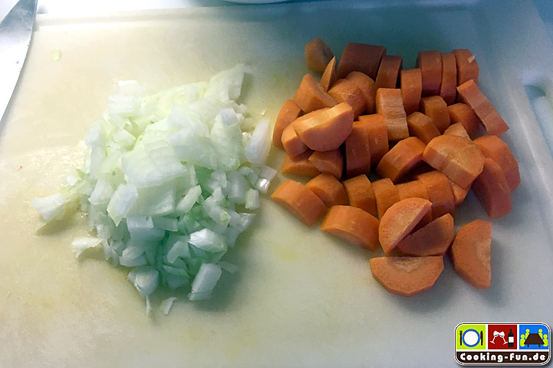 Zwiebeln abziehen und würfeln, Karotten putzen und kleinschneiden.