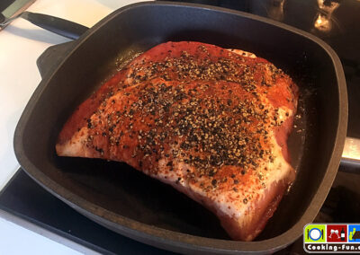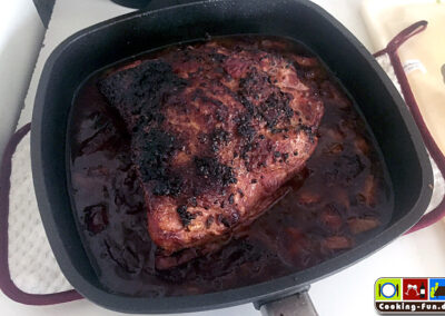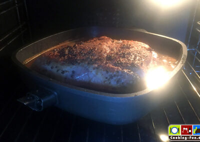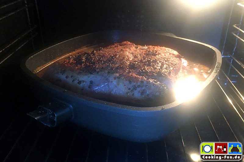 In einen Bräter (oder große, schwere Pfanne) das Fleisch in wenig Öl scharf auf der Rippenseite anbraten, dann auch kurz die Seiten und die Pfeffer-Oberseite anschwitzen (Den Pfeffer nicht verbrennen lassen, wird bitter). Fleisch aus dem Bräter heben und beiseitestellen.
