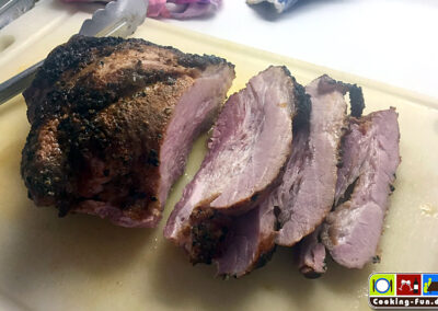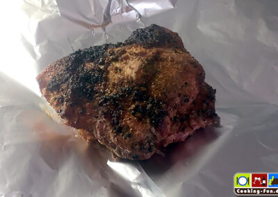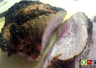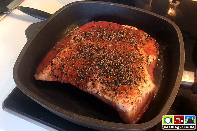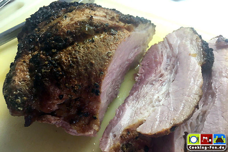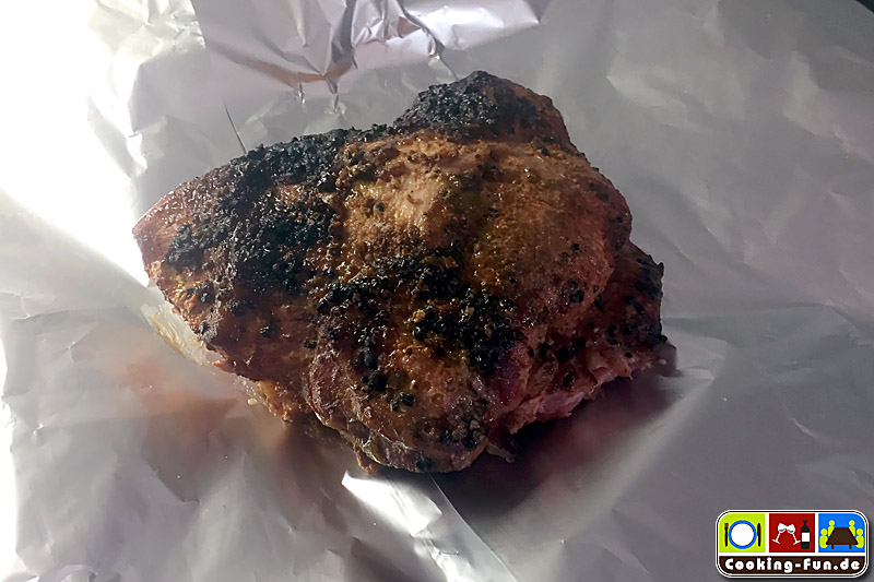 Die Dicke Rippe stammt aus der Schweinebrust, hat etwa 20% Fettanteil und kommt zumeist mit Knochen (Rippen). Vom Fleischer meines Vertrauens bekam ich ein fertig mit Pfeffer eingeriebenes Prachtstück (Pfefferrippe). Durch die mittige Fettschicht bleibt das Fleisch herrlich saftig. Ein echt unterschätzter Sonntagsbraten, der zudem ganz einfach zuzubereiten ist.