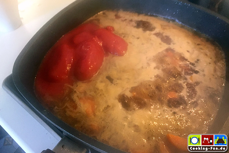 Im gleichen Fett die Zwiebeln und Karotten anschwitzen. Wenn sie anfangen Farbe zu nehmen Gemüse an die Seite schieben und das Tomatenmark für eine Minute mit anschwitzen. Sodann mit dem Dunkelbier ablöschen und etwas reduzieren lassen. Dosentomaten zugeben, einmal aufkochen, die Pfefferrippe mit dem Knochen nach unten daraufsetzen und ohne Deckel für 1,5 Stunden im vorgeheizten Ofen schmoren.