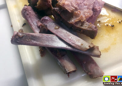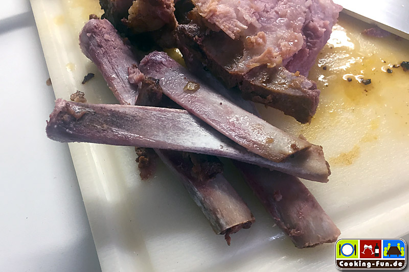 Nach dieser Zeit den Braten aus der Soße heben, Knochen rausdrehen (das Fleisch sollte vom Knochen fallen), in Alufolie wickeln und im auskühlenden Ofen bei offener Tür ruhen lassen.