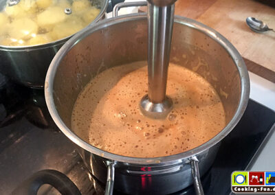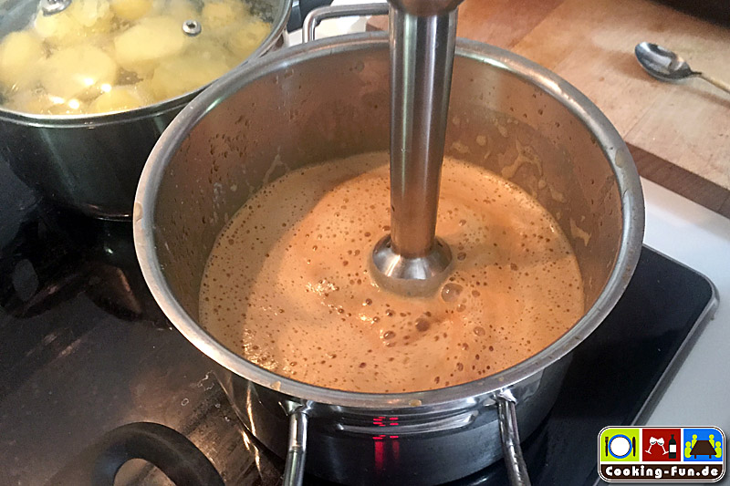 Die Soße absieben, in einem Topf etwas reduzieren, Sahne zugeben und abschmecken. Wir wollten sie etwas dickflüssiger haben, darum haben wir einen Teil der abgesiebten Karotten wieder zugegeben und mit dem Mixstab püriert.