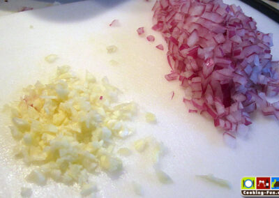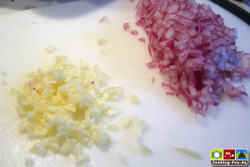 Schalotten (alternativ Rote Zwiebeln) und Knoblauchzehen schälen und fein würfeln.