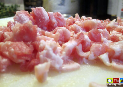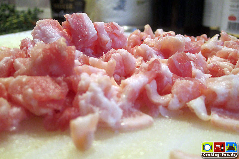 Vorarbeiten: Den Speck fein würfeln, Zwiebeln schälen und fein würfeln, Knoblauch schälen und feinst würfeln (oder durch die Presse geben), Pilze putzen und bis auf 2 Champignons zum Garnieren fein würfeln (auch die getrockneten). Schokolade in Streifen schaben z.B. mit einem Trüffelhobel.