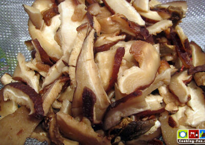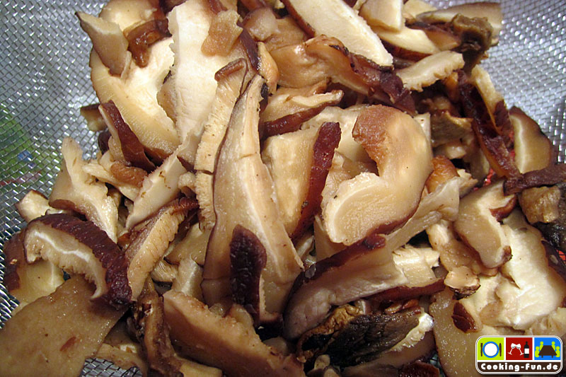 Die getrockneten Pilze gemäß Packungsangaben ca. 30 Minuten in gerade genug Wasser einweichen, dann durch ein Sieb abgießen und ausdrücken, dabei das Pilzwasser auffangen. Darin steckt viel Aroma. Die getrockneten Pilze können jederzeit durch frische (insbesondere Steinpilze) ersetzt werden!