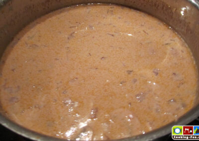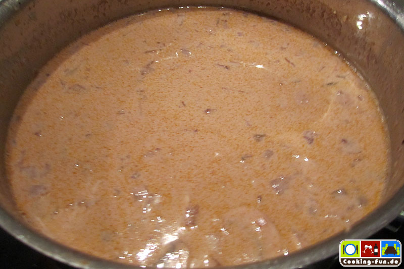 Dann das Tomatenmark zugeben. Nach etwa 3 Minuten mit Wein ablöschen, etwas reduzieren lassen und anschließend einen Großteil der Sahne (400ml) und 100ml vom Pilzwasser (oder Pilzfond o.ä.) zugeben und einmal kurz aufkochen lassen.