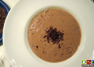 Die Suppe auf die Teller verteilen und mit den Schokoraspeln sowie einer Scheibe Champignon (von den übrig gelassenen) dekorieren.