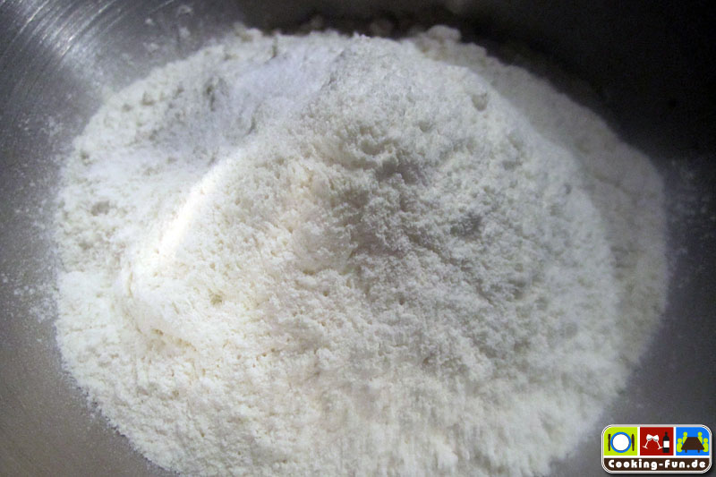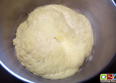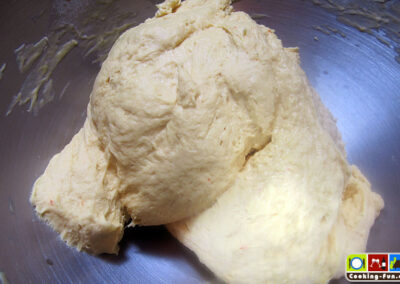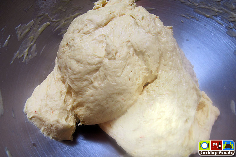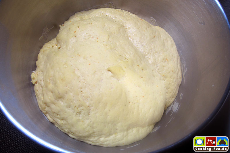 Jetzt muss der Teig gehen. Die Rührschüssel dazu mit einem leicht feuchten Tuch bedecken und bei eingeschaltetem Licht für ca. eine Stunde in den geschlossenen Ofen stellen. Der Teig sollte in dieser Zeit sein Volumen ungefähr verdoppeln.