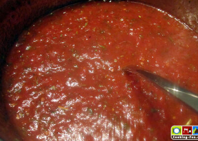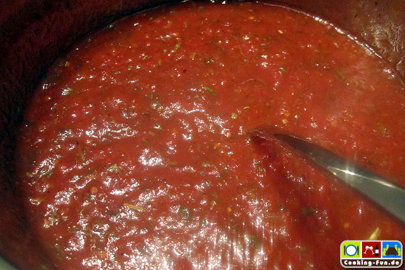 Für Eilige: Bei der Tomatensoße darf auch auf den Soffritto-Ansatz verzichtet werden und ersetzt ihn einfach durch gewürzte passierte Tomaten (warm machen und abschmecken), aber die Mühe lohnt sich.
