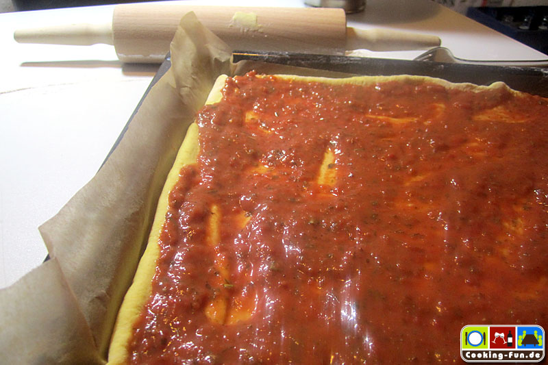 Den aufgegangenen Teig noch einmal kräftig durchkneten (wenn er zu sehr klebt, etwas Mehl verwenden) und mit dem Nudelholz auf Blechgröße ausrollen und mit einer Gabel in regelmäßigen Abständen ein paarmal einstechen. Auf dem Backblech Backpapier auslegen oder das Blech einfetten und den Teig darauf auslegen.