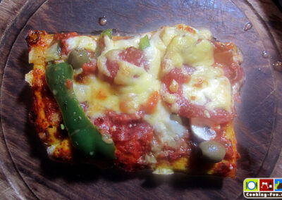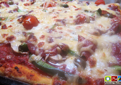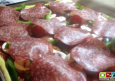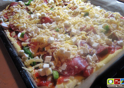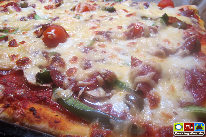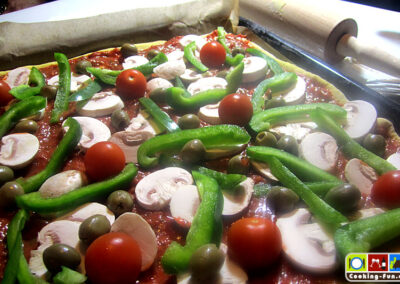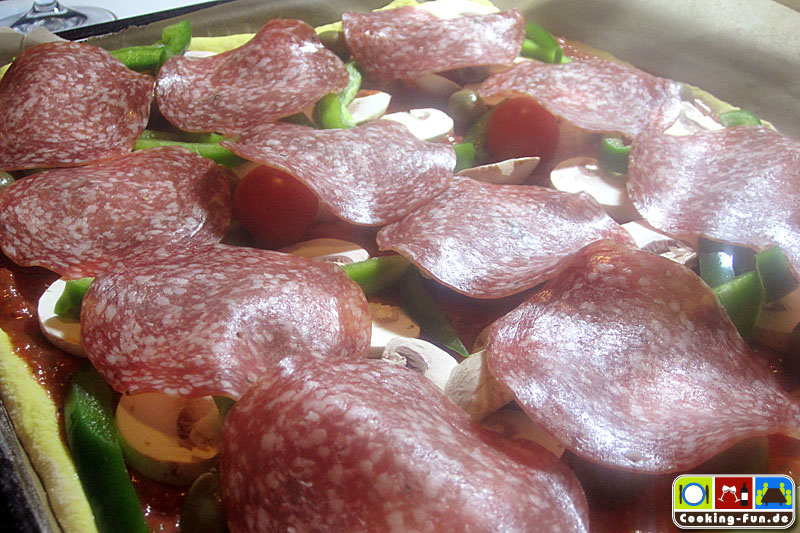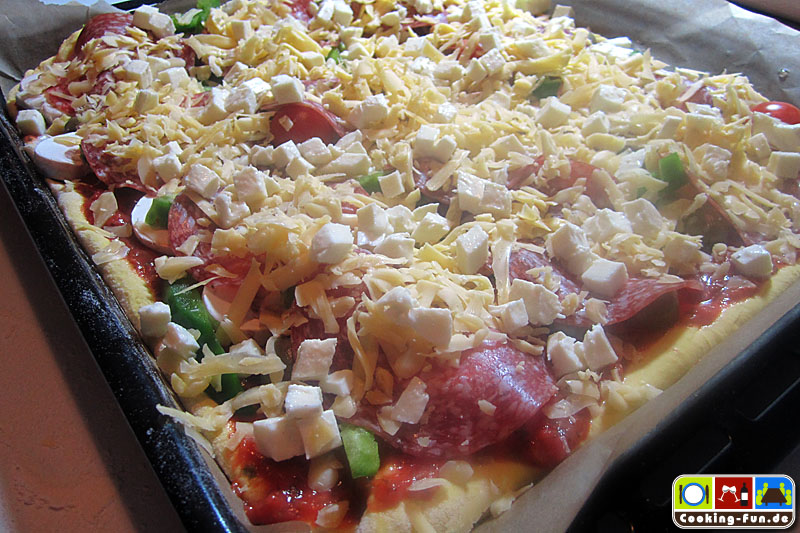 Gemüse für den Belag vorbereiten. Hier hatten wir Kirschtomaten und Oliven im Ganzen, Paprika entkernt und in Spelten geschnitten, Pilze geputzt und in Scheiben sowie pikante italienische Salami in dünnen Scheiben. Nun noch den Mozzarella würfeln und den Gouda reiben.