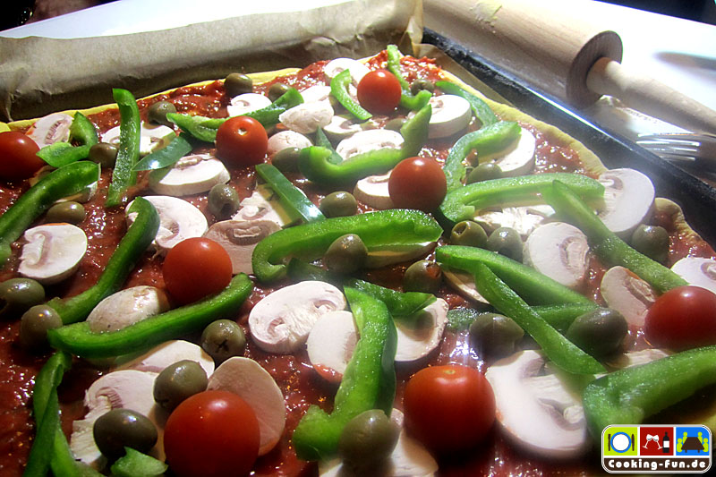 Tomatensoße und dann die anderen Zutaten darauf verteilen und mit Käse bestreuen. Wobei es italienischer ist, den Käse unter den Zutaten zu haben und eben niccht alles damit zu überbacken. Aber entscheidet selbst, hauptsache ist doch, dass es Euch schmeckt!!!