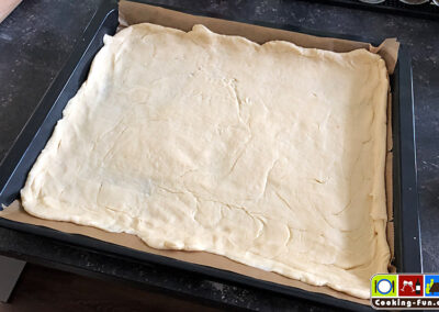 Nun den Teig auf einem mit Backpapier belegten Backblech ausrollen, dabei den Rand etwas hochziehen.