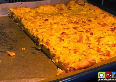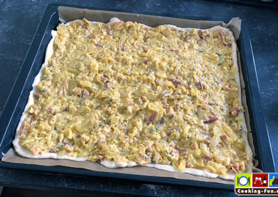 Teig mit dem Belag (s.u.) gleichmäßig belegen und ab in den auf Ober-/Unterhitze 180 °C (Umluft 160 °C) vorgeheizten Ofen.