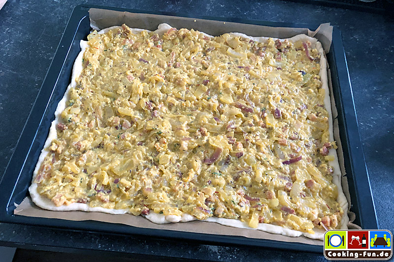 Es folgen die Saure Sahne, Eier und Gewürze, die mit den Zwiebeln und dem Speck vermischt werden. Die Konsistenz sollte nach dem Stocken der Eier eher fester sein, keine Soße.