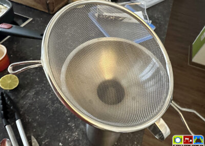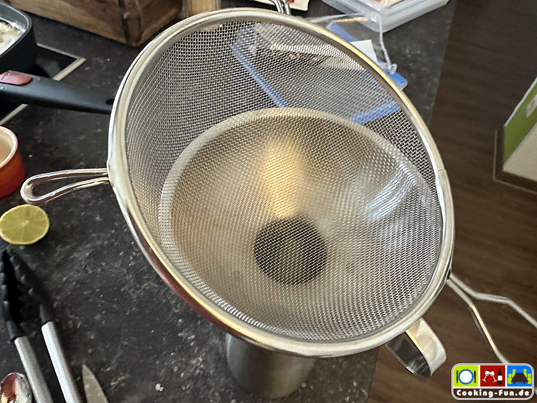 Einen Metall-Sahnespender könnt ihr in ein 70°C warmes Wasserbad stellen, so bleibt die Sauce über längere Zeit warm (ohne auszuflocken).