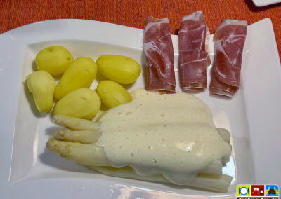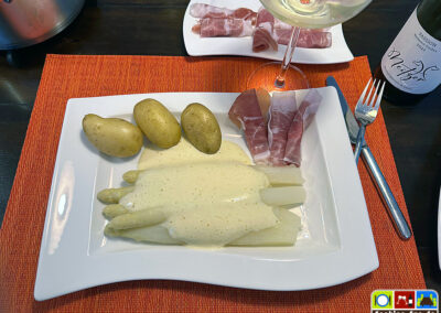 Den Sahnespender dann wie gewohnt benutzen, um die Sauce zu servieren. Immer zuerst einen ersten Probe-Sprühstoß in z.B. ein kleines Schälchen, dann auf den Teller. Hier im Bild mit Spargel aus der Region.