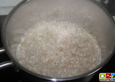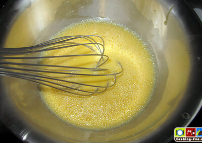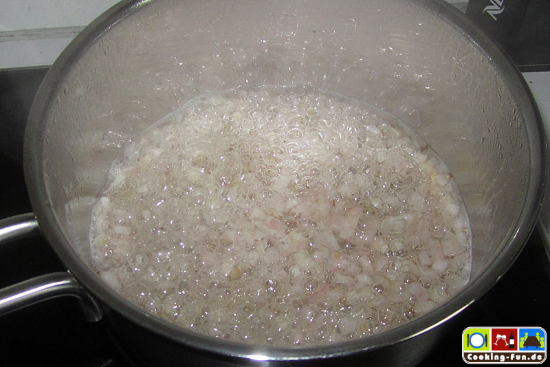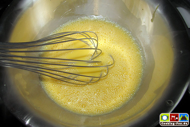 Einen Topf mit Wasser auf ca. 80°C erhitzen, darauf sollte die Schlagschale passen, denn wir brauchen gleich ein Wasserbad.