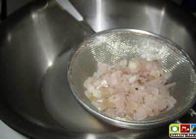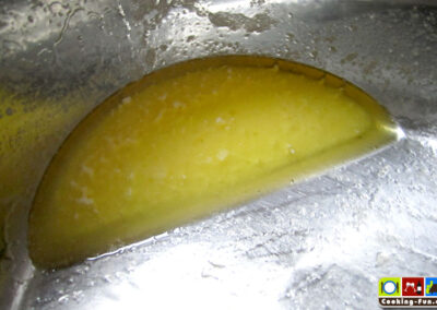 Parallel dazu die Butter in einem Topf auf kleiner Hitze schmelzen, dabei nicht rühren. Ziel ist es, die Butter zu klären. Die Molkereste sinken zu Boden und oben auf ist die klare Butter. Ist dieser Zustand erreicht, gießt man die Butter vorsichtig durch ein feines Sieb in einen Becher mit Ausgießer. Die Molkeschicht soll dabei im Topf verbleiben und wird entsorgt.