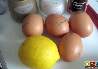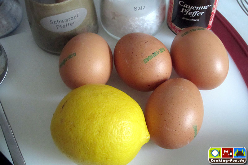 Die Eigelbe zum Schalottenwasser in die Schlagschüssel geben und über das heiße Wasser hängen. Nun fleißig mit einem Schneebesen rühren und nicht damit aufhören. Die Masse wird recht fix zu einer dickflüssigen Creme, dann vom Wasser nehmen, stabil hinstellen und die Butter ganz langsam eintröpfeln und unter die Eigelb-Schalottenwasser-Masse schlagen. Die Konsistenz wird wenn die Butter dazukommt immer etwas „krisselig“ und man muss fleißig rühren, um eine ebenmäßige Creme zu behalten. Nach und nach kann man die Butter schneller zugeben. Immer auf die Konsistenz achten. Eventuell kurz mal nur rühren und keine Butter zugeben. Wenn alle Butter eingerührt ist, kommt der Saft der halben Zitrone, ein gestrichener TL Salz und Cayennepfeffer nach Belieben hinzu. Nochmals kräftig durchrühren und möglichst gleich servieren.