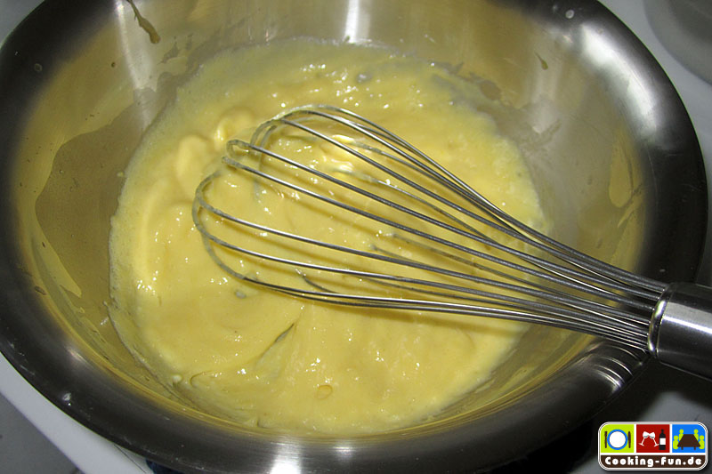 Zum Warmhalten kann man das Gros des Wassers vom Wasserbad weggießen, so dass nur noch etwas im Topf ist und die Schlagschüssel wieder darüber hängen. Es darf nicht zu heiß sein.