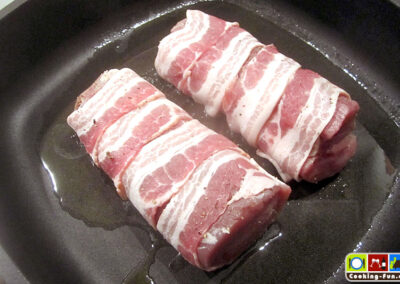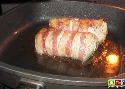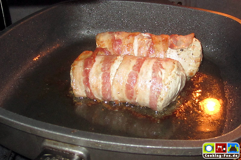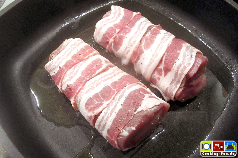 Das Öl in einer schweren und ofenfesten Pfanne erhitzen und die Fleischstücke darin von allen Seiten anbraten. Als erste Seite nehmt die mit den zusammenlaufenden Speckenden. Ist der Speck unten schön knurpsig (kross angebräunt) wird gedreht. Mit der Drehung auf die letzte Seite, kommt die Pfanne für ca. 20 Minuten in den vorgeheizten Ofen. Die letzte Seite brät dort durch die Wärmespeicherung der Pfanne nach.
