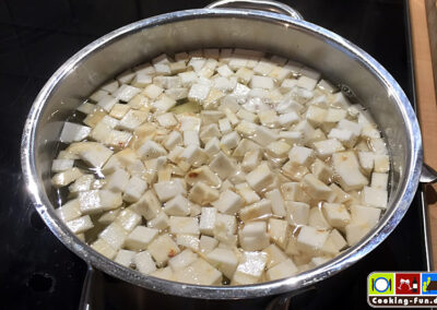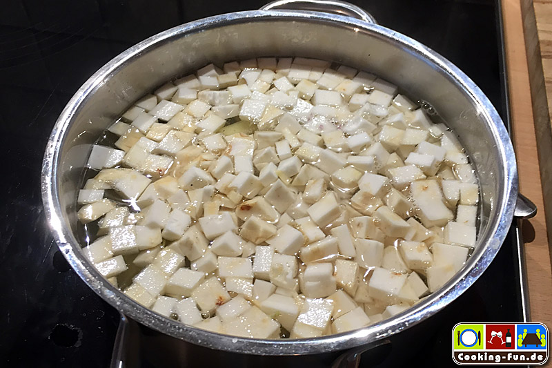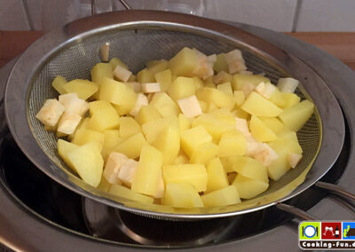 Sellerie und Kartoffeln putzen, schälen und grob würfeln. Beides in kochendem Salzwasser garen und abgießen.