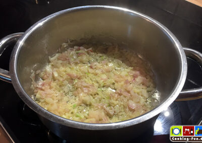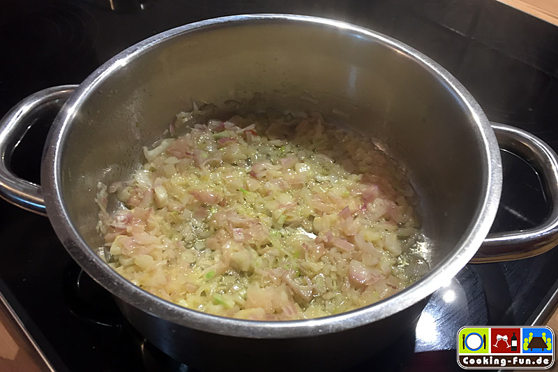 In einem Topf die Schalotten in der Butter glasig dünsten (mittlere Hitze, sie sollen nicht schwarz werden).