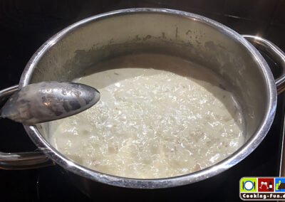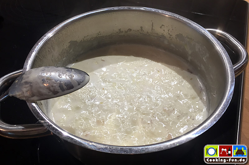 Sahne und Fond zugeben und offen bei hoher Temperatur auf etwa 150ml reduzieren. Etwas davon abschöpfen und später je nach gewünschter Konsistenz wieber beimengen.