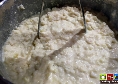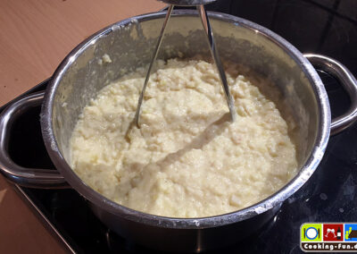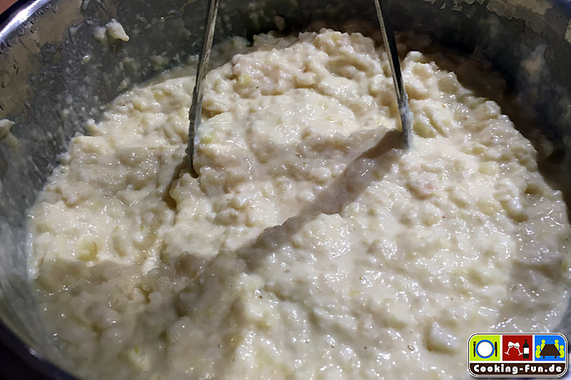 Sellerie und Kartoffeln zugeben, mit dem Stampfer (notfalls auch mit dem Mixstab) zu einem Püree verarbeiten und mit Salz und wenig frisch geriebener Muskatnuss (nur wenn Kartoffeln verwendet werden) abschmecken. Nun kann die Konsistenz noch mit der abgeschöpften Flüssigkeit nach eigenem Gusto justiert werden.