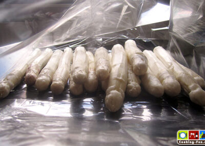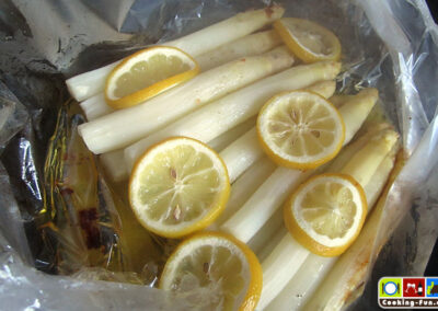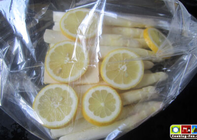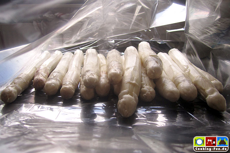 Meistens koche ich den Spargel ja „ganz normal“ in Wasser, wenn ich am Folgetag jedoch keine Zeit habe, eine Spargelcremesuppe aus dem sonst anfallenden Kochwasser zu machen, ist diese Zubereitung prima, da der Spargel wenig Wasser abgibt und das volle Aroma behält. Zudem geht es schnell und einfach. Man kann sogar vorportionieren und für jeden ein eigenes Paket packen.