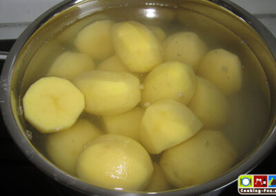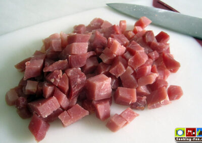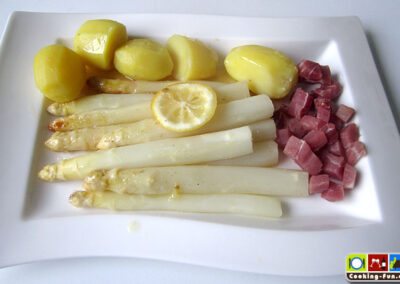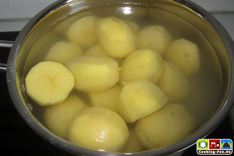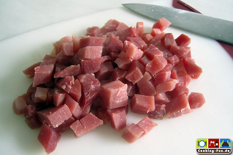 Zeit, um Kartoffeln zu putzen oder zu schälen. Je nach Größe brauchen die ca. 20 Minuten zum Garen in Salzwasser. Dann noch die Beilage fertigen, ich hab einfach und schnell einen schönen Schinken von Sehnen befreit und gewürfelt. Ohne Schinken haben wir jedoch ein schönes, vegetarisches Gericht.